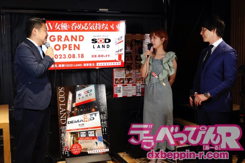 また、再開に伴い全フロアをリニューアルし、風営法の許可を取得したからこそ楽しめるプランもあることが発表され、「指湯」や「童貞スナック」など、SOD LANDらしさを失わない楽しいオプションが紹介された。