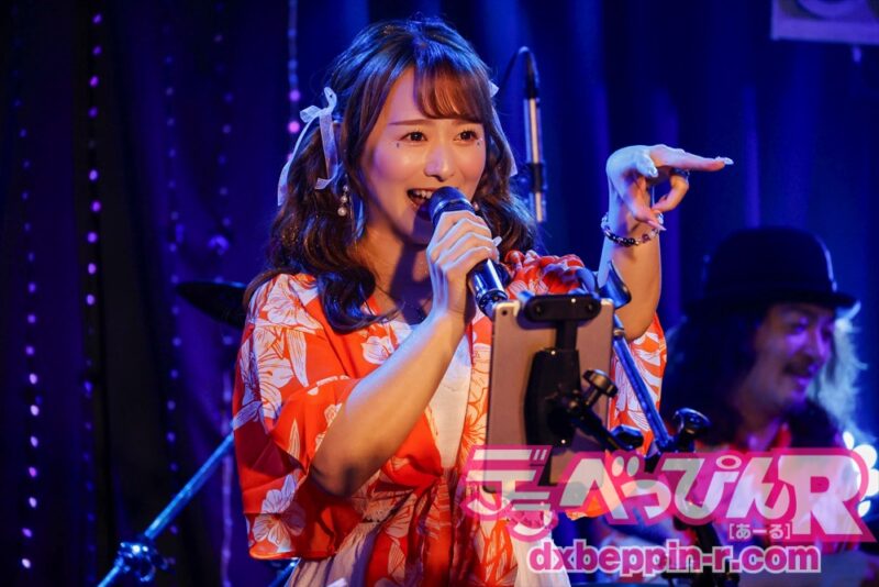 まりりんとバンドメンバーは夏らしくアロハシャツ姿で登場。1曲目から3曲目まではハードな楽曲でいきなりライブを盛り上げます。