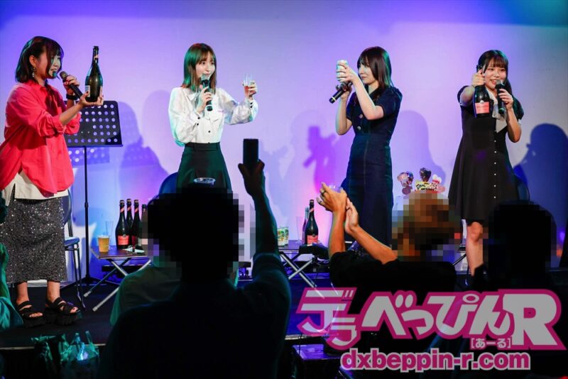 ステージにはファンから贈られた祝福のシャンパンやおつまみが大量に並べられ、そのシャンパンを景気よく開封します。