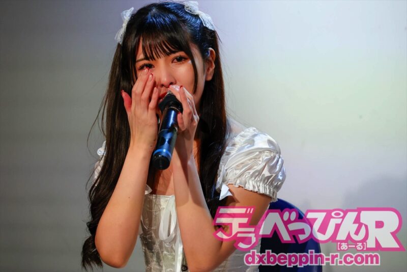 最後に感想を求められると、お兄ちゃんたちの優しさとライブが出来る喜びから、思わず感激の涙を流すしおりちゃん。「こんなにたくさんの人が来てくれて、メレンゲを始めて過去一楽しかったし、また、ちはるんと出来るなんて幸せです」とコメント。
