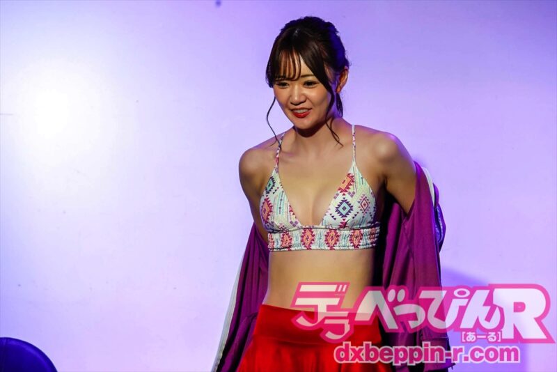 そして、いよいよ対戦となりますが、ステージ上で恥ずかし気にジャージを脱ぐ姿も見どころ。最初からビキニ姿で登場しないところがニクイ演出となっています。