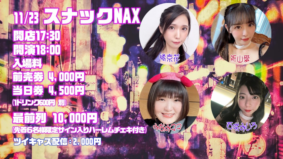 大人気レギュラーイベントの「スナックNAX vol.11」が、11月23日、東京・レフカダ新宿で行われ、橘京花さん、祈山愛さん、百咲みいろちゃんが出演。司会進行は事務所マネージャーのみなみマネが務めました!
