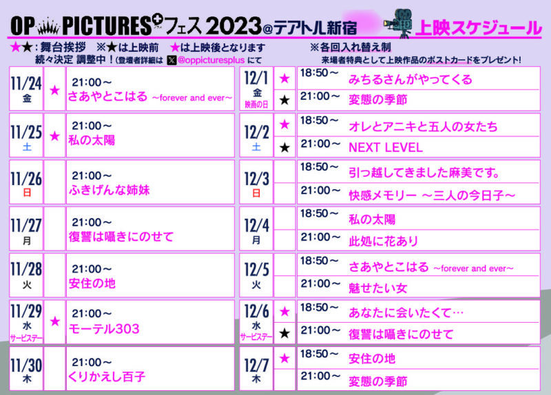 11月24日より東京・テアトル新宿で盛大に開幕したR15版ピンク映画の祭典『OP PICTURES+フェス2023』も折り返し地点に達し、連日盛況を誇っている。