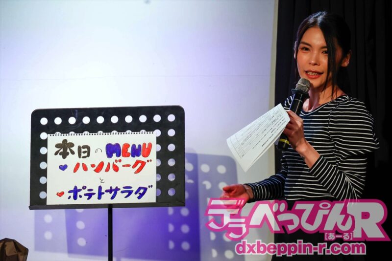 その間は遥希ちゃんがステージに残り、調理するモニターを観ながらファンと交流トーク。ファンから「得意料理はなにか」と聞かれた遥希ちゃんは、「肉じゃが、ハンバーグ、ピーマンの肉詰めなどです。最近は作り置きしています」とコメント。