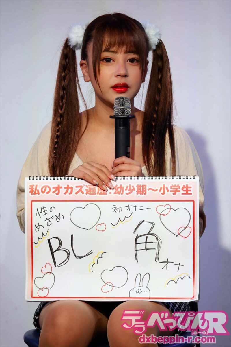 しおんちゃん曰く、「性の目覚めはBLで初オナニーは角」とのこと。そこを掘り下げて聞くと、「本屋さんでエッチなBLが買えたんです。小学3、4年生の頃に知らないで買ったら、こってりBLでした。最高なものが売っている、こんないいものが売っているんだと思った」とのことで、BLとのファーストコンタクトを話してくれました。