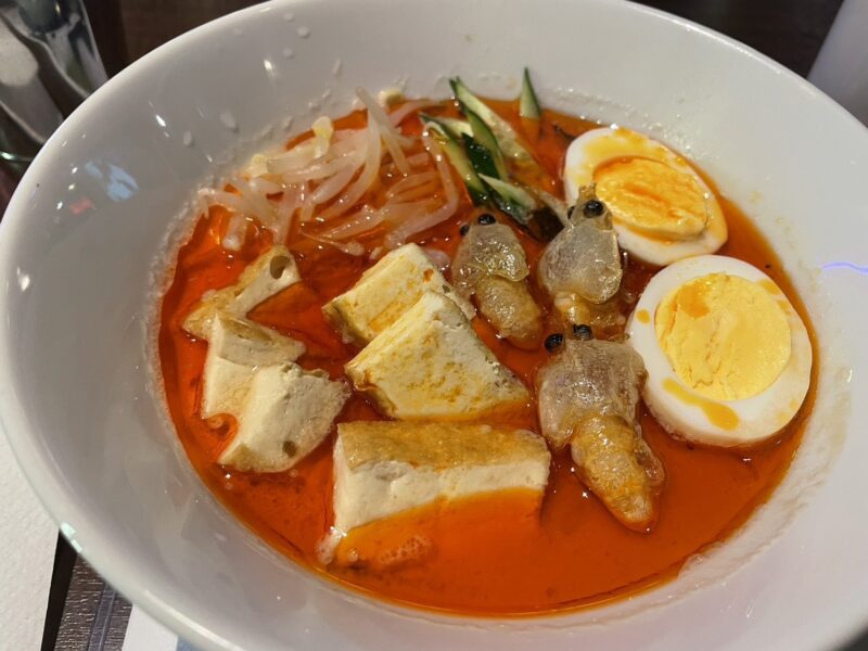 今回のいちみおちゃん特別コラボメニュー。チーズたっぷりのラクサ&カプレーゼにラッシーのセット。