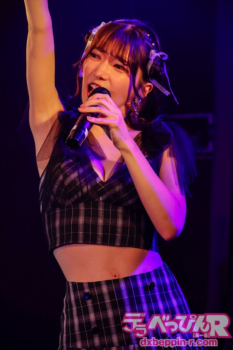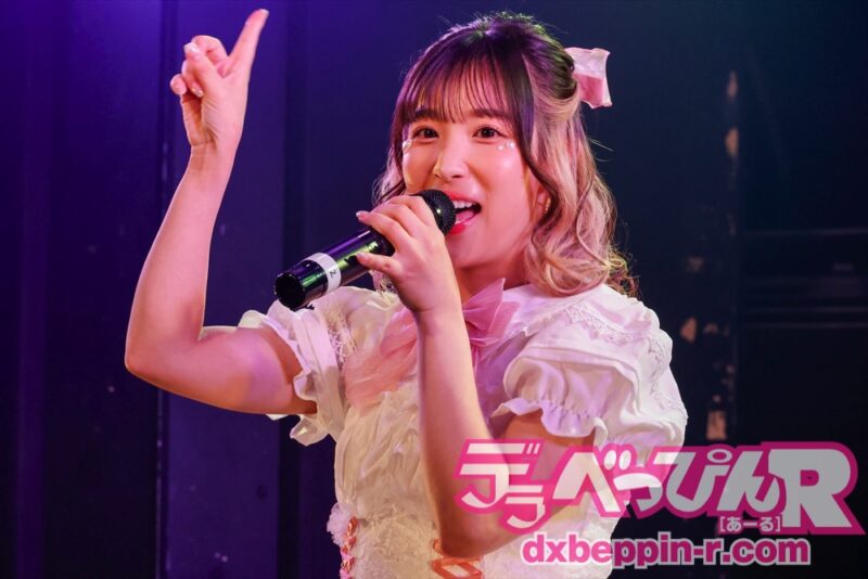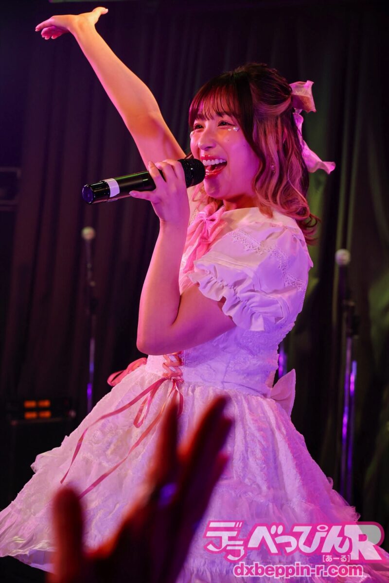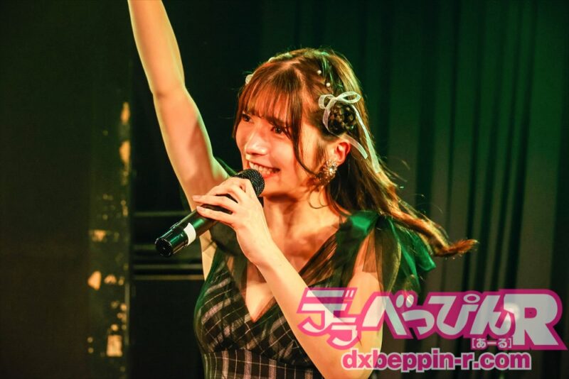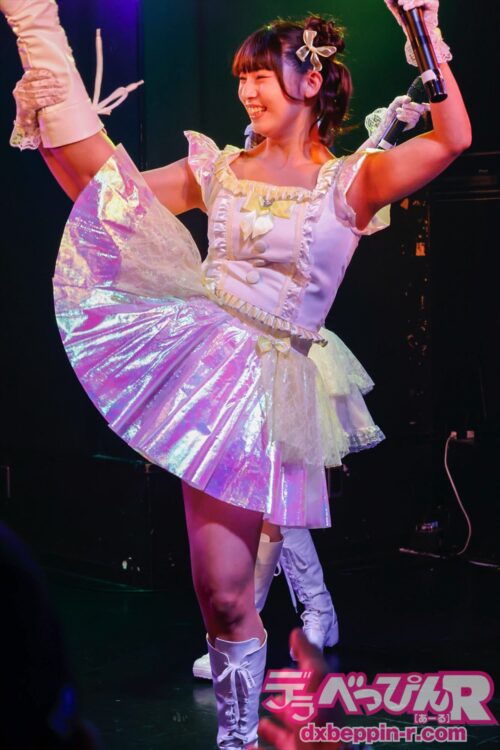 「久しぶりのライブで緊張している」と言いますが、1曲目はオリジナルの『世話焼きガール』でステージを縦横無尽に飛び回り、明るく楽しいパフォーマンスを見せてくれます。2曲目もオリジナルの『Kazamidori』で、いつも通りキュートなポーズを決め、かわいさ世界一であることを証明してくれました。