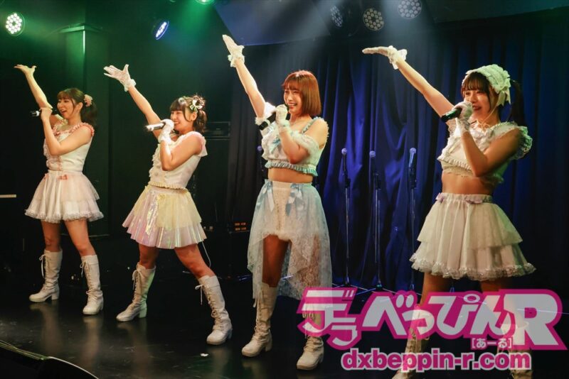 mumk(宝田もなみさん、宇流木さららさん、美園和花さん、柏木こなつさん)は久々のライブ出演! 華やかでノリもいいので、もっとライブに出てほしいものです。1曲目はオリジナルでグループのイメージ曲でもある『Welcome mumk World!』からスタート! メンバー個人の自己紹介を兼ねたパートもあり、4人の個性が際立ちます。