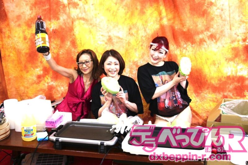 そんな友田さんの隣りにはもう1人の助っ人。前回も気合いでお餅300個を焼き続けてくれた縄師ZIMAさんの嫁の麻雨さん。麻雨さんは前回大人気だった褌姿で焼きそば焼き。こんな感じで巨乳2人が並ぶ焼きそばゾーン。ここだけでも十分、絵になる画でした。