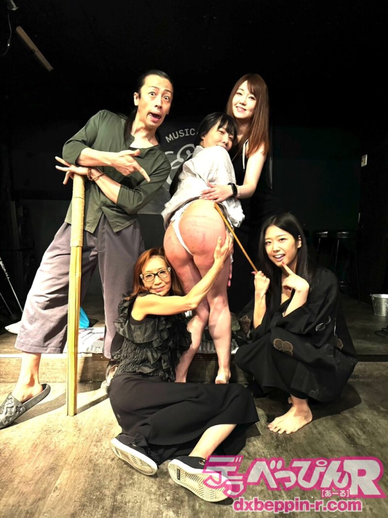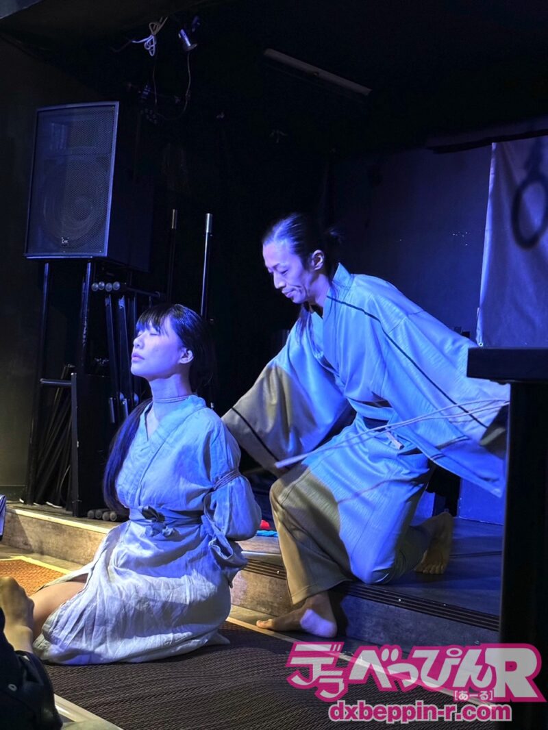 そしていよいよラストの緊縛ショー。縄師はVOL.14で、かすみさんの縄を担当した鵺神蓮氏。淡々と縄のステージが始まり、かすみさんもしっとりな責められ顔。これだけでも十分だと思うけど、呼ばれてなんちゃらで菜々ちゃんが竹鞭片手に登場。竹のがデカいじゃんか。菜々ちゃんが小さな身体をフル回転させながら竹鞭を振り上げる。かすみさんのお尻や太腿に何度か叩き込む。菜々ちゃんの頭の上には「せーの!」って見えそうな位に必死。
