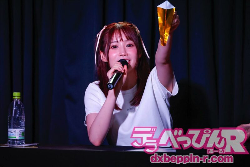 続いては「紙飛行機飛距離対決」が行われ、自分で折った紙飛行機を会場フロアに飛ばしますが、ここでハプニングが発生! 制作時にかなりうんちくを語ったななちゃんでしたが、実際に飛ばすと空中で一回転し飛距離を稼げず着地。これにはファンが大爆笑します。