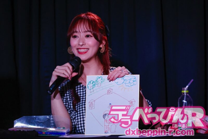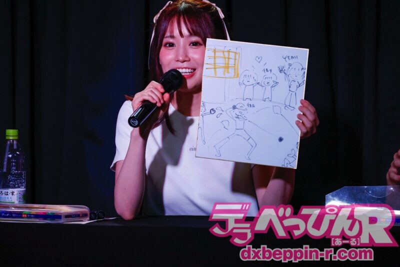 一方の茉莉奈さんは3メートルほどの飛距離を記録し、これで2連勝となりましたが、特別にもう一回戦が追加され、「野球」をイラストで描く、お絵描き対決が行われました。絵は苦手と言っていた茉莉奈さんですが、要所要所を抑え、ファンからの拍手の多さで3連勝を飾り、ゲーム対決コーナーは完勝しました。