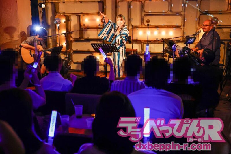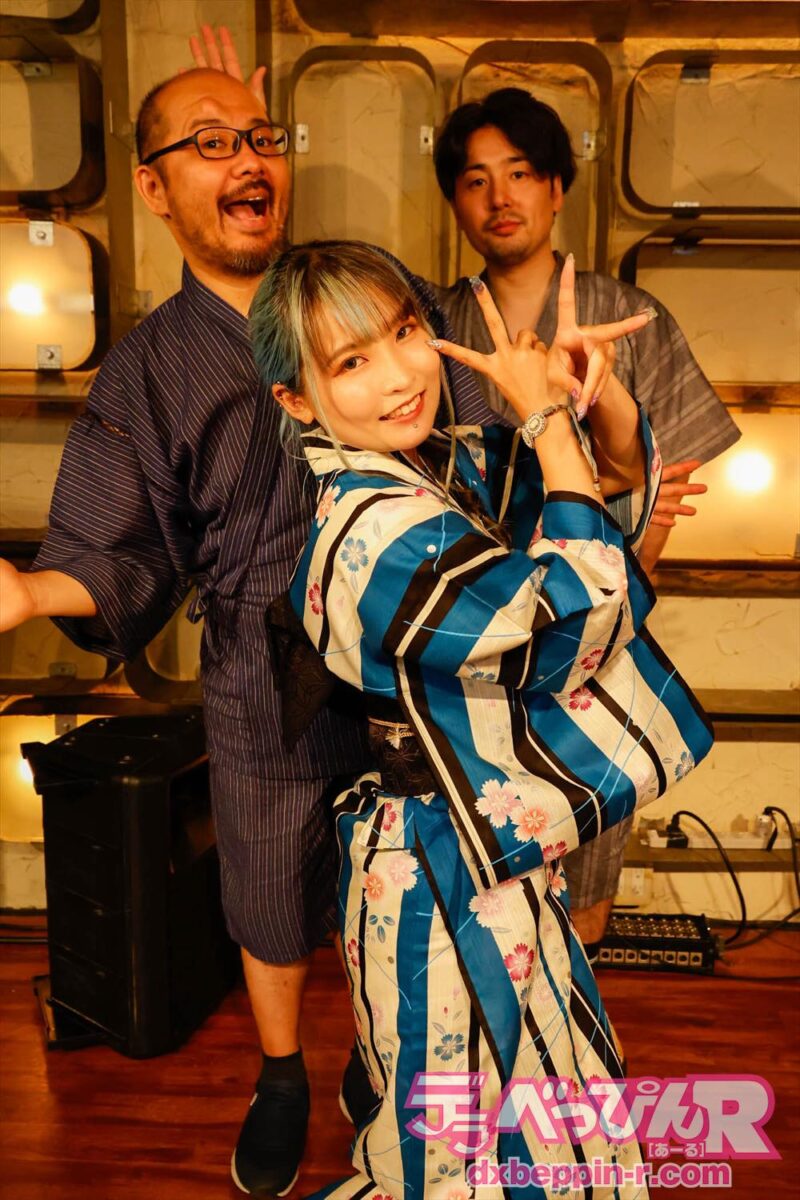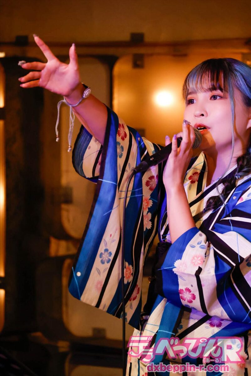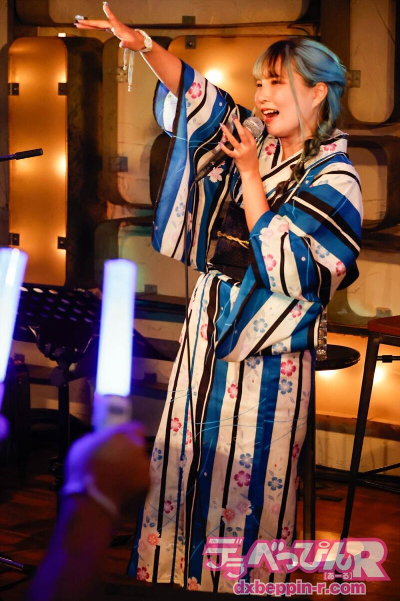 夏らしく浴衣での来場を呼び掛けたあおいちゃんは、自身も美しい浴衣姿で登場。ギターの福田正人さんと、ピアノ&コーラスの平方元さんも甚平姿で登場し、夏祭り気分を盛り上げます。