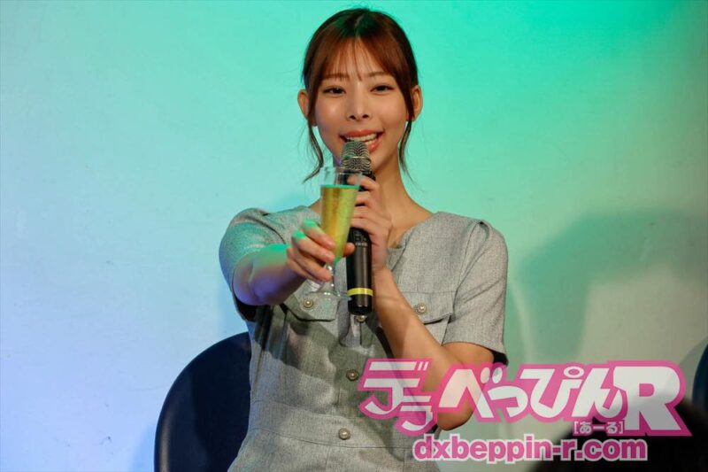 女優としての目標は、「AV女優と言えば名前が出るくらい大きくなりたい」と言うと、ファンからは拍手が起こります。