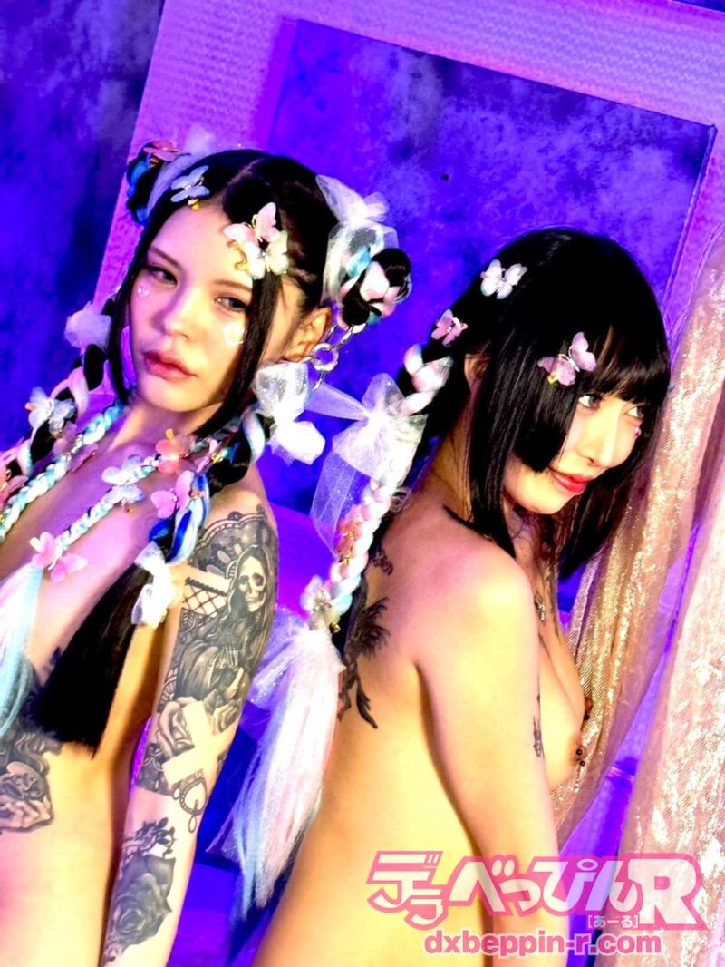 とりあえず衣装が無いから最初から全裸待機な2人。ヘアだけがカラフルに目立つ。