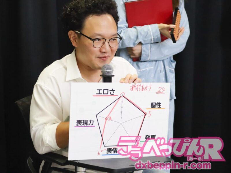 続いてのチャレンジは「アドリブレズ演技」!一流女優ならば即席ペアでもエロくきるはず……。ということで急きょ2人ペアをつくり、設定・道具・ラストの台詞を選んで即席のレズドラマを演じます。もちろんその演技は、森林さんがチャートを使って評価。