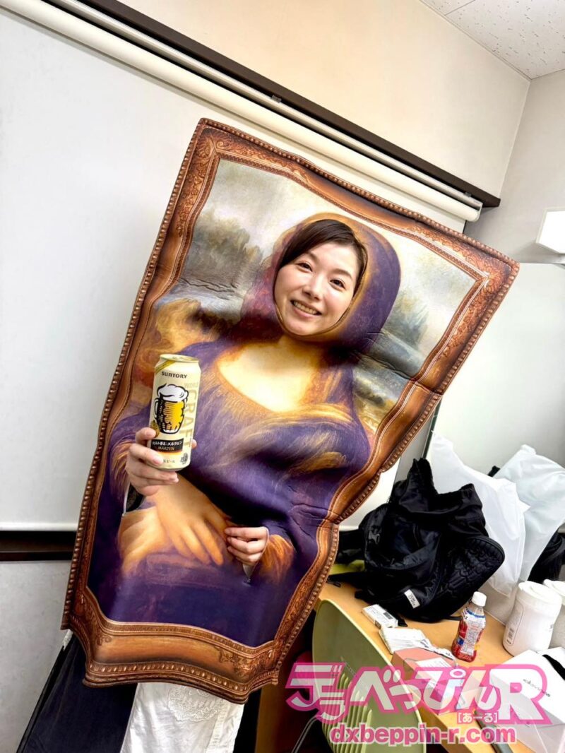 袋の中から出して来た本日の衣装。なーんとモナリザ。え? どう着るの? と思ったら大きな筒袋になっていて、顔と手が出せる仕様。マジかーめっちゃ笑った。そしてなんと言っても似合っちゃってる所が大爆笑。全く違和感ないんだもん。サイズ感もぴったり。
