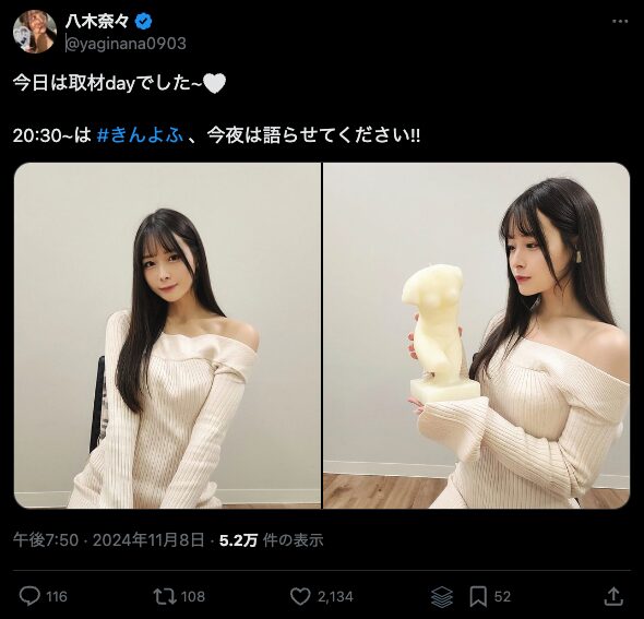 「今年の懺悔」をテーマにしたトークでは、八木奈々ちゃんが「事務所に飾ってある蝋で作られたオブジェを落としてしまった」と告白。きっとこのXの投稿後に落としたのでしょうか。