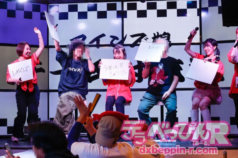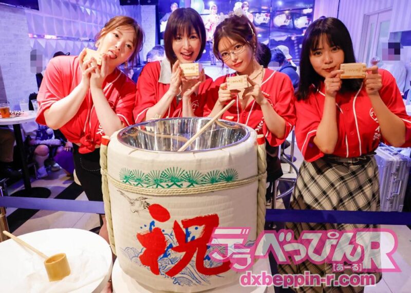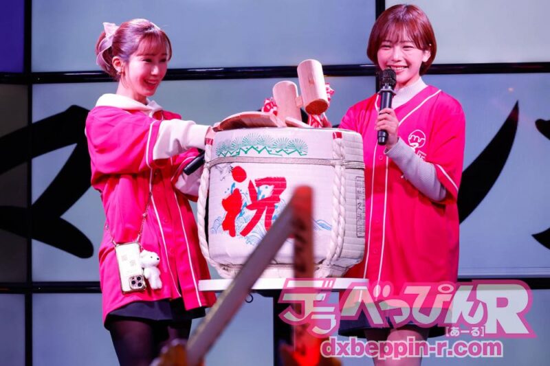 その後、ステージ上では紗倉まなちゃんと小島みなみちゃん、客席フロアでは仁藤さや香ちゃん、田野憂ちゃん、善場まみちゃん、Himariちゃんが「マインズ15周年おめでとう!」の掛け声とともに鏡開きを行い、清酒をファンに振る舞い、乾杯でイベントの幕が本格的に開きました。