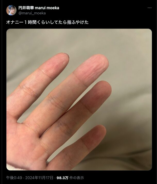 話題の投稿はこちら。中指がふやけた写真が添えられており、現在ではインプレッションが約100万を超える勢いです。