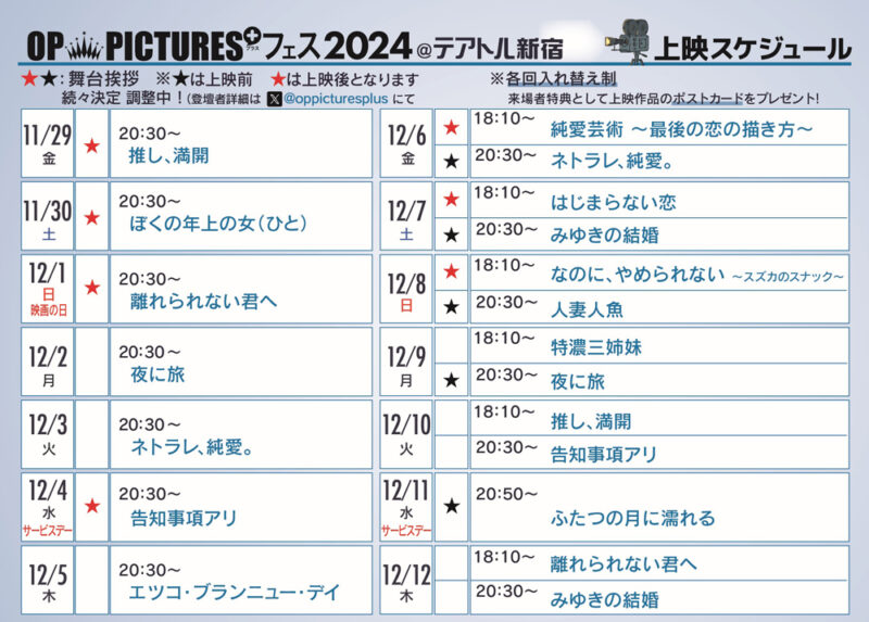 今年も多くの人気女優が出演する『OP PICTURES+フェス2024』は、12月12日まで開催され、舞台挨拶も行われるので、最終日までR15版ピンク映画を楽しみましょう!