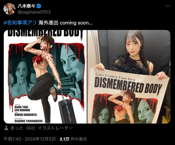上映後、奈々さんのXには、同作の英字ポスターを手にした写真が投稿され、「告知事項アリ 海外進出 coming soon…」との文字が! 奈々さんが国際的スターになる日が近いかもしれませんので、今後の、動向を見守りましょう。