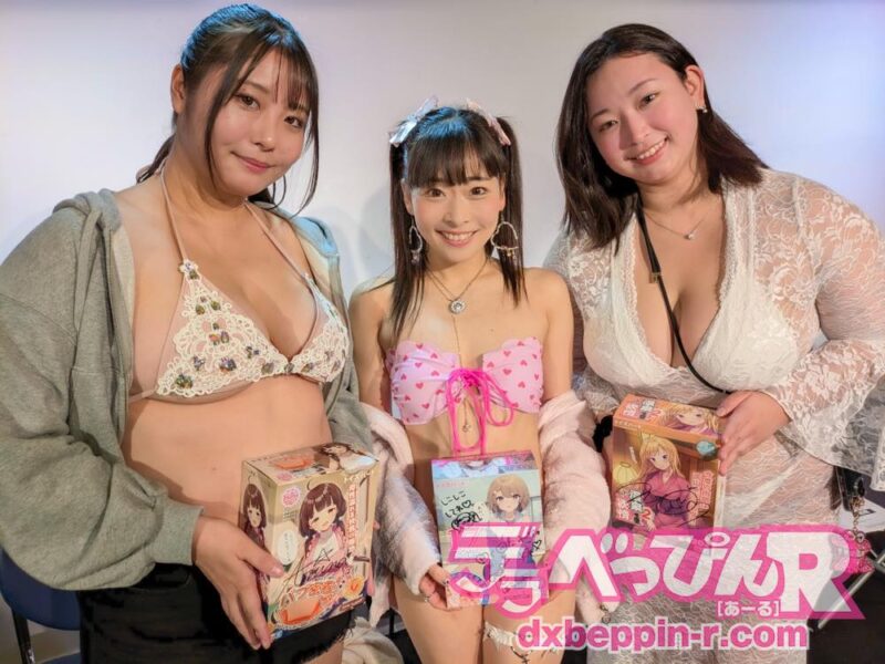 開場前の現場にお邪魔するとリハーサル中で、イベントで行う『おっぱいにオナホを乗せ乗せゲーム』(※文字通りおっぱいの上にオナホがいくつ乗るかを競うゲーム)をテストしている最中。まずMCの美織ちゃんが挑戦したところ一つも乗らなかったのですが、麗央ちゃんと明日菜ちゃんが試してみたら2人とも用意していたオナホ8個を楽勝でおっぱいに乗っけてしまうではありませんか! しかも下乳に挟むなどの余裕も見せていて、これには美織ちゃんも「巨乳ってスゲえ!」とビックリしていました。