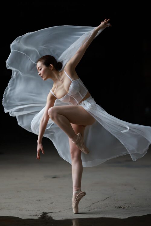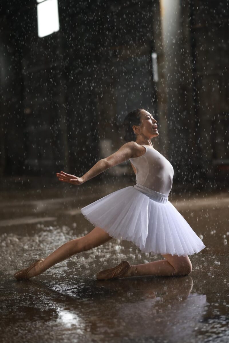 撮影の日は土砂降りで、非常に寒い日でした。コンクリートの上でトウシューズを穿いて踊るのは初めての経験で、寒さのために筋肉が固まっていき、つま先の部分がだんだん崩れていきました。立っているのも難しくなり、体の筋肉がかたまり、重く感じてきました。でも、その写真を写真集の最後のページに持ってきてくれたことには、すごくストーリーを感じています。