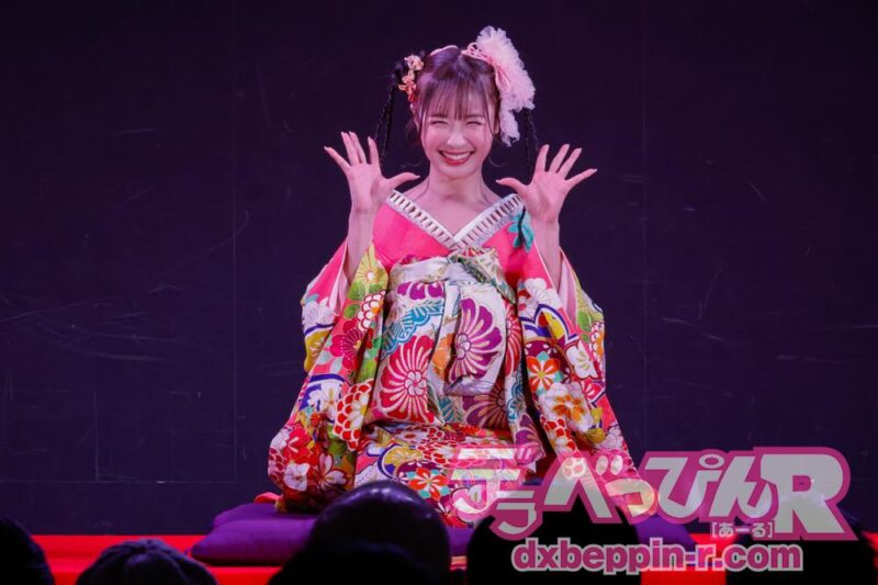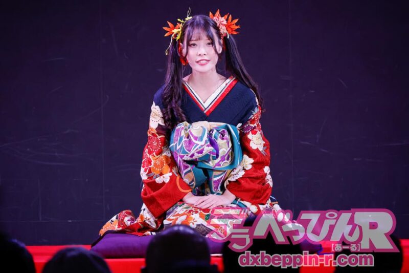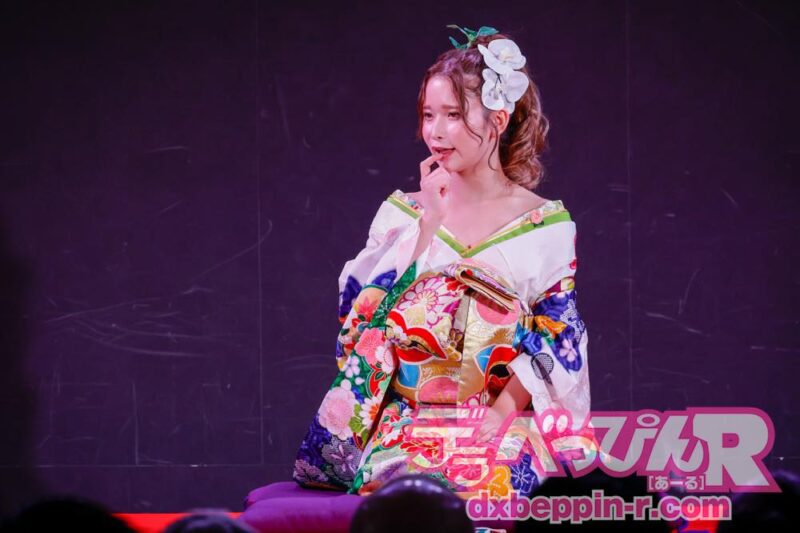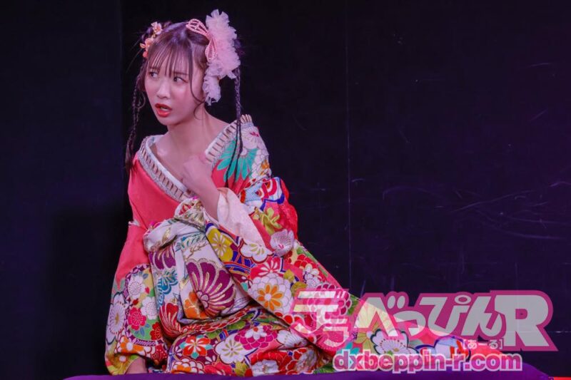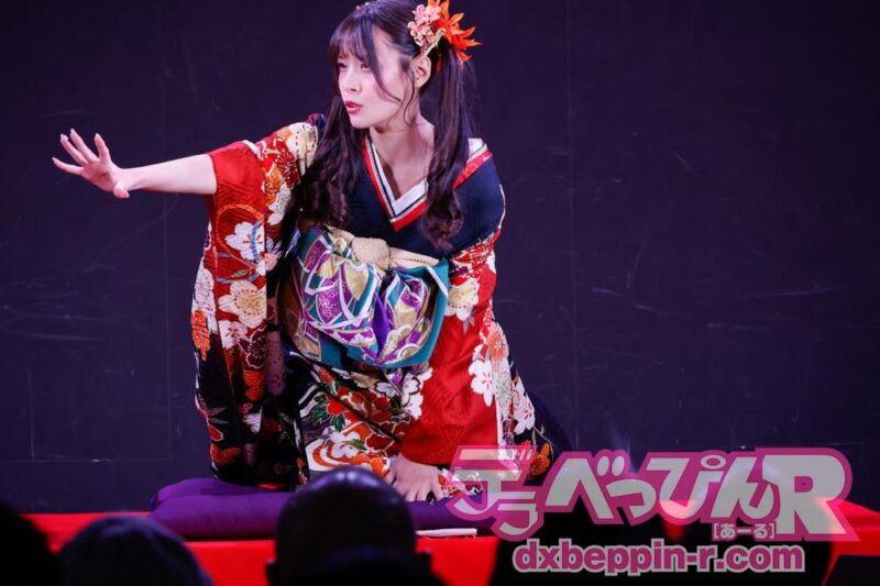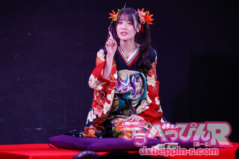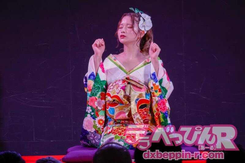 そして、いよいよ猥談落語が開演。まず高座に上がったのは花魁姿の莉緒ちゃん。演目『やるの? やらないの? Do? Don’t Do?』では、エッチを望む女性と、それに気づかない鈍感な男性のやりとりをコミカルかつセクシーに演じました。