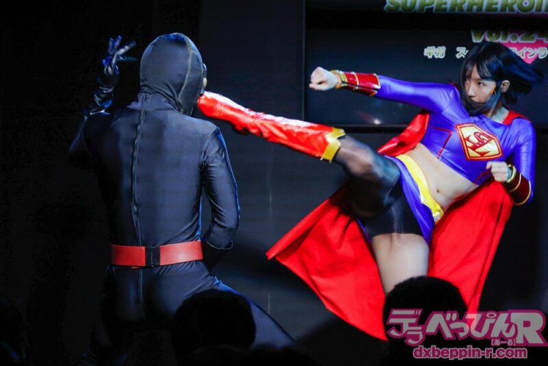 その大卒エリート戦闘員が開発した強化スーツを着た戦闘員たちは、レイラちゃん(セキュア3号)とめいちゃん(ファントマイエロー)と壮絶な戦いを繰り広げます。普段は簡単に追い詰められ、親玉の怪人に反撃を頼る戦闘員たちが、強化スーツを装備して奮闘する姿に観客は釘付け。