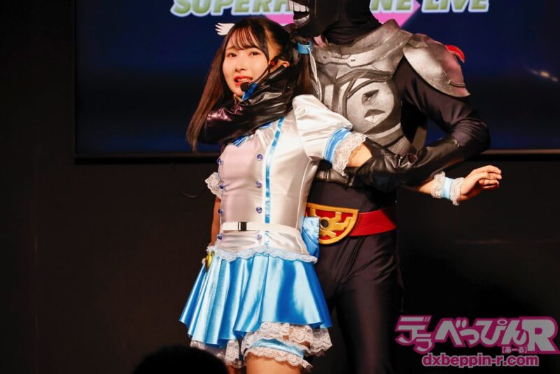 登場したヒロインたちは、天馬ゆいちゃん(パープルサターン)、藤井レイラちゃん(セキュア3号)、深月めいちゃん(ファントマイエロー)、千石もなかちゃん(セーラーアクアス)、由良かなちゃん(リリーポップ)の人気セクシー女優5人。司会を務めたもなかちゃんが、4人それぞれに意気込みを聞きライブがスタート。5人とも気合が入ります。