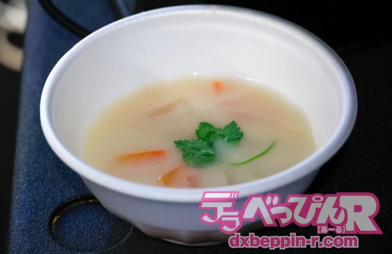 鍋の中で具材が柔らかく煮込まれ、白みそを溶き込むと、いよいよ関西風お雑煮が完成。遥希ちゃんが丁寧に器に盛りつけ、菜々ちゃんが優しい笑顔でファンに配布しました。