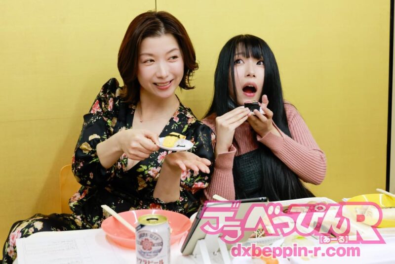 番組中盤には、視聴者から贈られたお寿司が登場。家庭用の回転寿司マシーンに乗り、お寿司がクルクル回るのですが、このマシーンのモーター音が電マに似ていることから、「電マ寿司」と命名し、はしゃぐ2人。