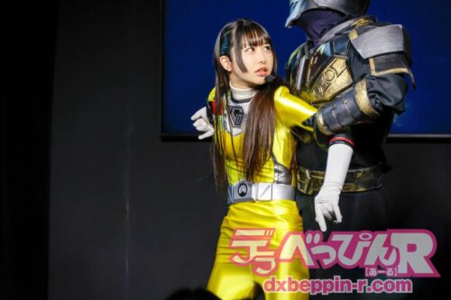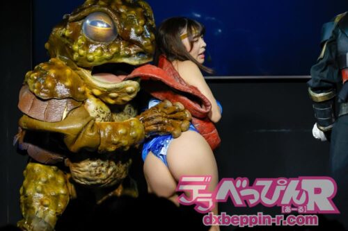 しかし、怪人たちも反撃を開始。不気味なカエル怪人が登場し、舞ちゃんの首に長い舌を巻きつけ、窒息寸前に追い込みました。すると、あっという間に形勢が逆転し、怪人たちに囚われた2人は、抱え上げられて股間やお尻を晒されるという屈辱を受けて撃沈。