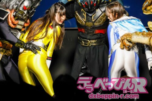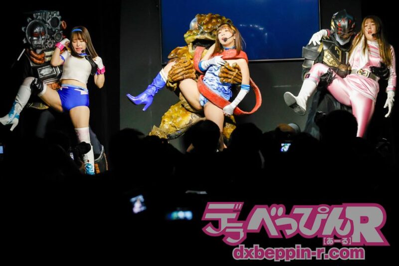無情にも、ヒロインたちは再びお尻と股間を晒される恥辱攻撃で敗北。超満員の客席からはカメラのシャッター音が響き渡り、ファンたちはその瞬間を熱心に収めました。