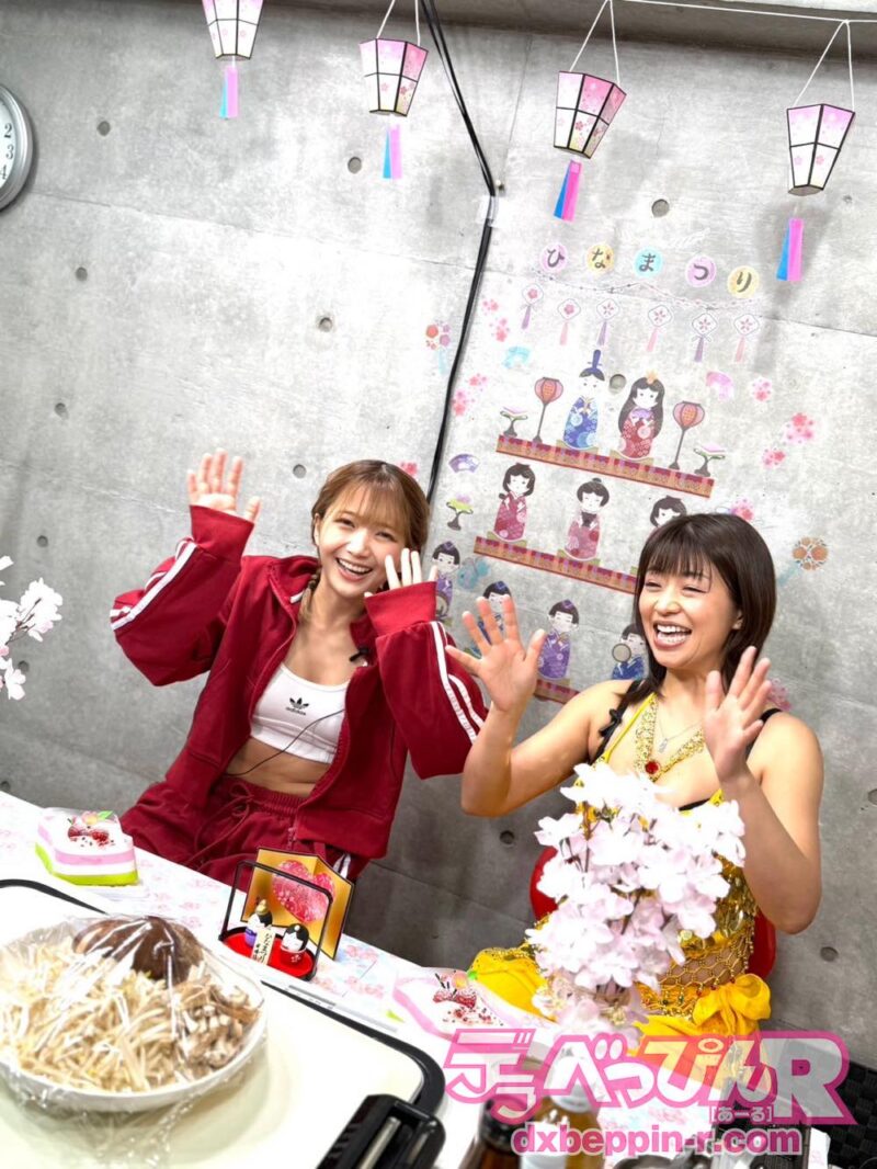 実はこの生放送がある数日前に、私と紗々で莉子ちゃんのベリーダンスお披露目的なイベントに行ったんだよね。その時に着てたベリーダンスのシャシャラ衣装が可愛くて「生放送の時もこれ着て欲しい!」ってお願いしたんです。紗々も「私も似た様なの持ってるからお揃いしましょ!」ってなってからの当日。何と莉子ちゃんはジャージ姿。紗々だけ1人気合い入ったベリーダンス衣装。なんじゃこりゃ?って大笑い。莉子ちゃん、すっかり忘れてたみたいでメチャクチャ謝り倒してました。でもでも、ジャージ着ててもセクシーに見せちゃうのが星乃莉子なんです!