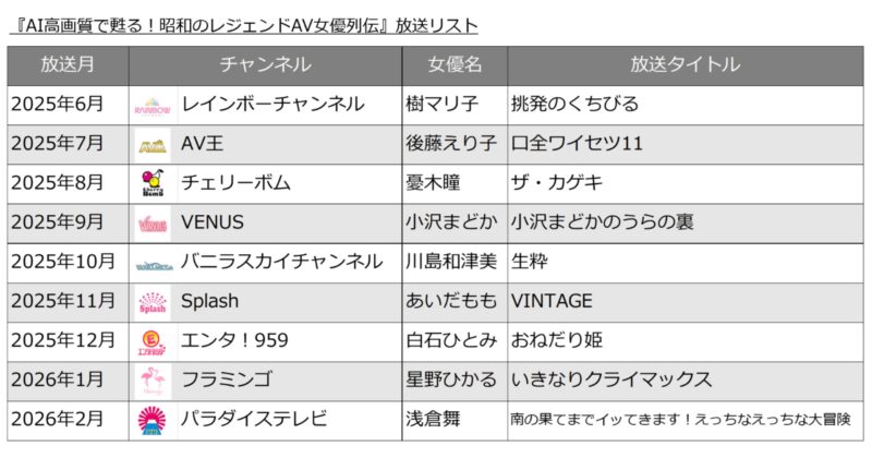 なお、今年6月から2026年2月まで、AI技術でリマスターされた往年の名女優作品が定期的に放送される予定。昭和のレジェンドAV女優たちの名作がどのように甦るのか、ぜひ楽しみにしたい。