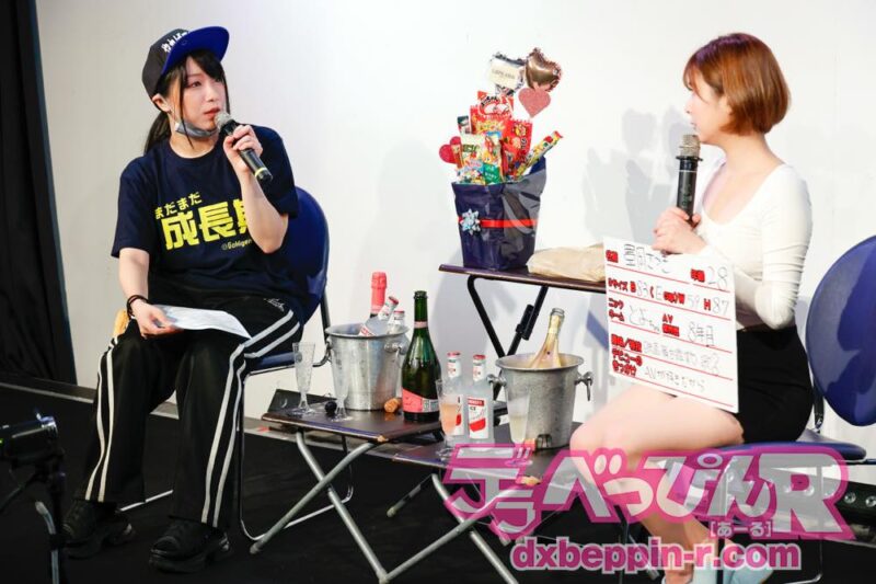 トークは徐々にアブない方向へと進み、「AVデビューのきっかけは、AVを観るのが好きでエロいことも好き。『AV 事務所』で検索し、一番上に出てきた事務所に問い合わせたら、ポンポン話が進んで今に至ります」とデビュー秘話を披露。一方のみっひーは「事務所所属後、3ヶ月間撮影がなかった」と告白。みっひーは苦労人なのです。