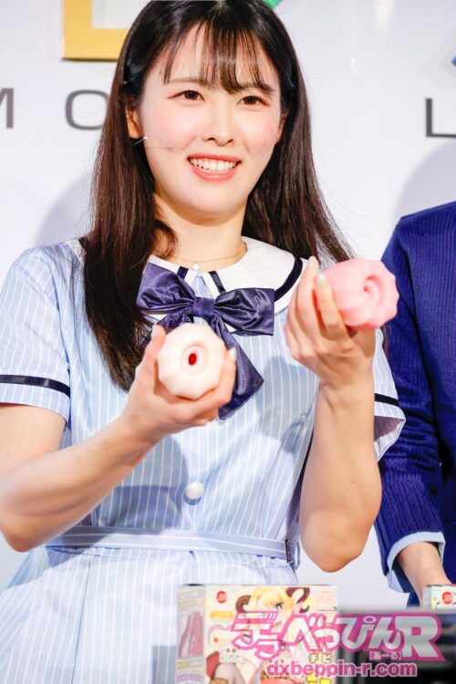 無事に商品説明が終わると、さりなちゃんが「いいね!」と愛ちゃんを絶賛。さらに、さりなちゃんがオナホールの中に指を挿入して感触を確かめ、「すごいね! フワフワ、トロトロだよ。赤ちゃんのほっぺみたい(笑)」と、商品の構造をユニークかつ分かりやすく説明。これには観客も商品に興味津々でした。