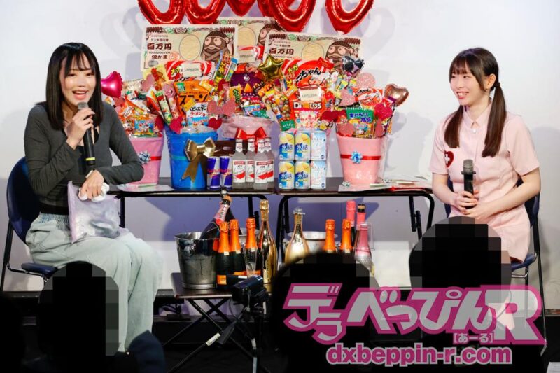 イベントはまず、ややちゃんによる影ナレ(影アナウンス)からスタート。この形式は、すでに定番化の兆しを見せています。そして2人がステージに登場すると、ファンからは大量のドリンクやおつまみなどが贈られ、あたたかい歓迎ムードに包まれました。
