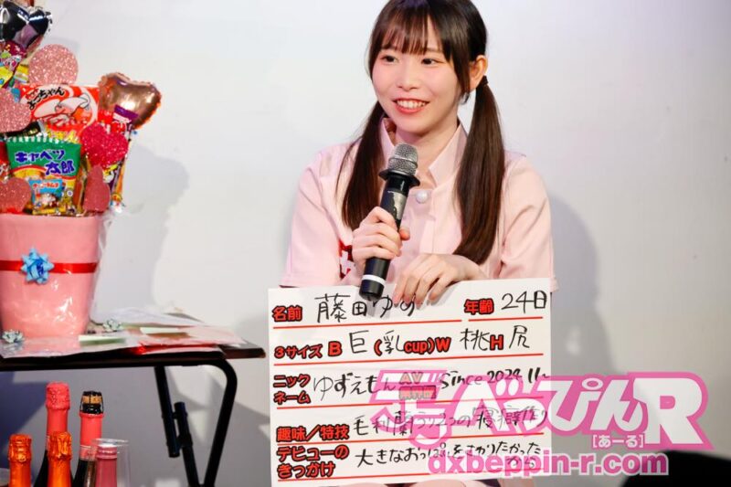 「3サイズは『巨乳、桃尻』。ニックネームは『ゆずえもん』。ドラえもんと合体させました」とユニークな自己紹介を展開。ちなみにニックネームの由来は「天のお告げ」とも語っていました(笑)。「AV業界歴は半年です」と紹介しつつ、すべての回答が変化球で構成されているのが、ゆずちゃん流のスタイル。