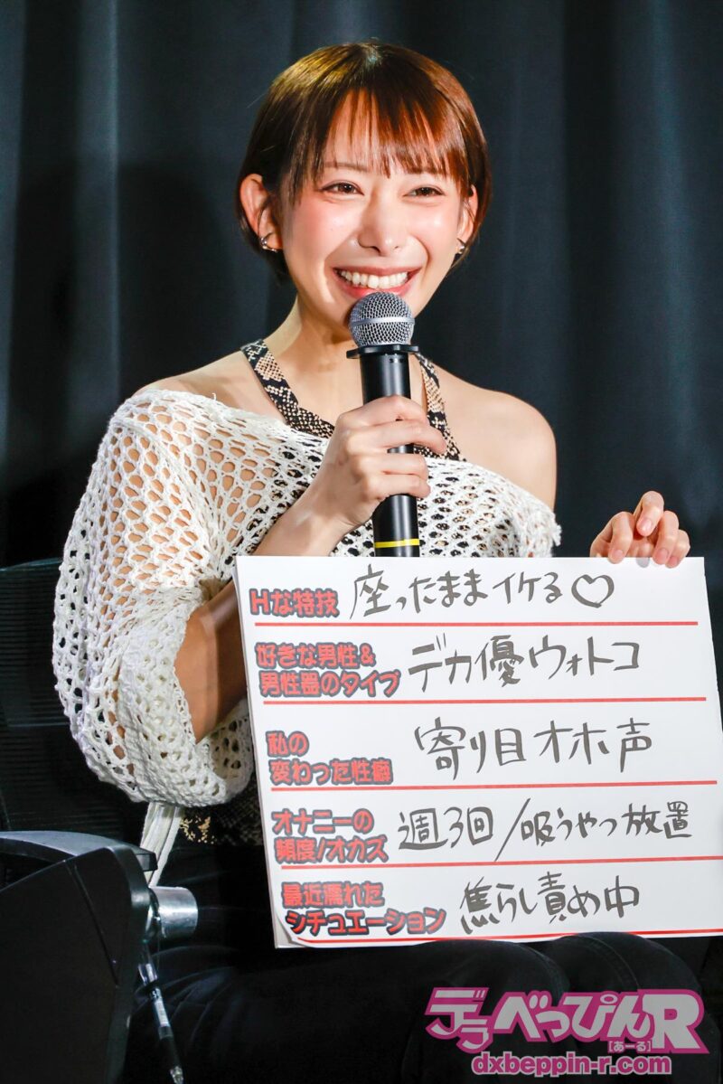 さらに、「セックス以外の好きな行為」を聞かれると、みづきちゃんは照れながら「あの…、あの…、セックスじゃない時にチ〇ポや乳首を触ってる時間が好き。手持ちぶさたの金玉もみもみが気持ちいい」と告白。「手持ちぶさたの金玉もみもみ」という名フレーズに、会場は大爆笑!