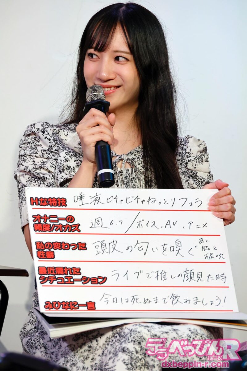 まりなちゃんのエッチな特技は「唾液びちゃびちゃネットリフェラ」。かわいい顔からの大胆発言に、会場は驚きの声が上がります。オナニーは「週6回、1日2~3回することもあります。オカズはボイス作品、AV、アニメ」とエロ全般に渡ります。