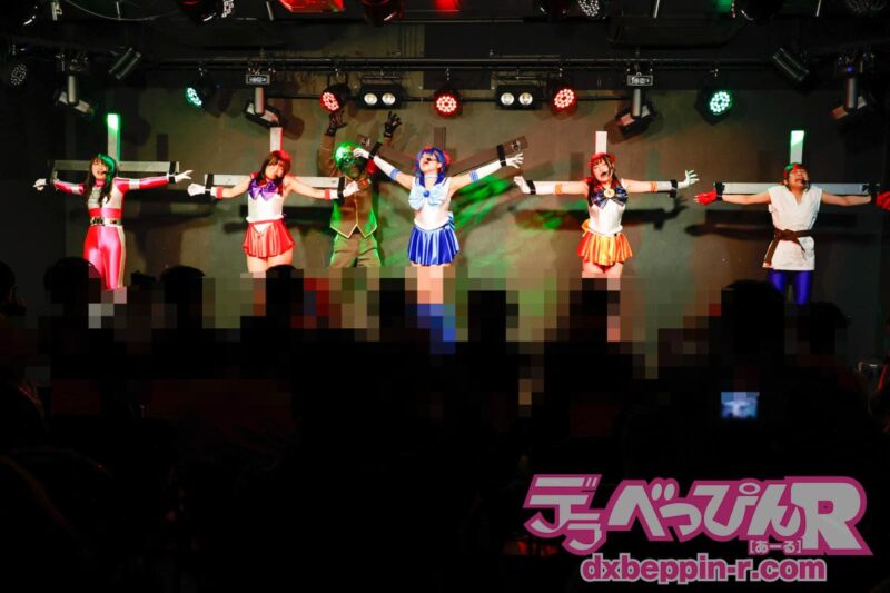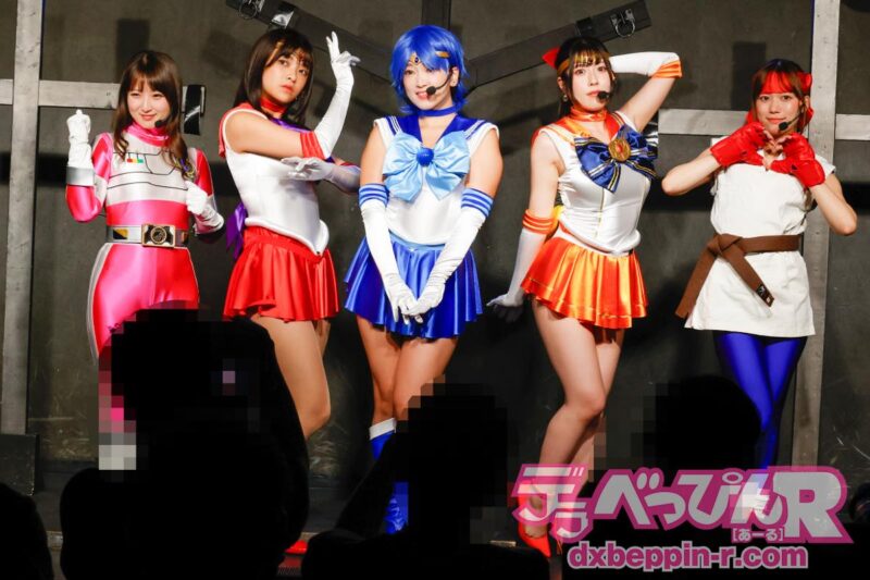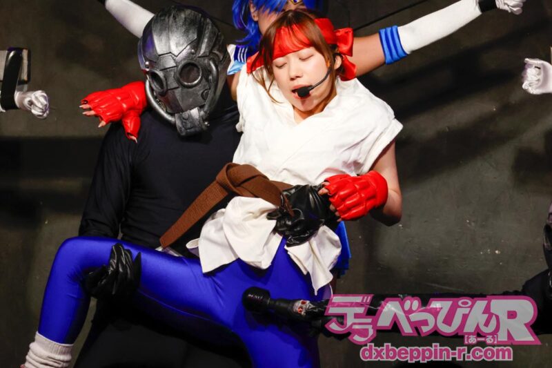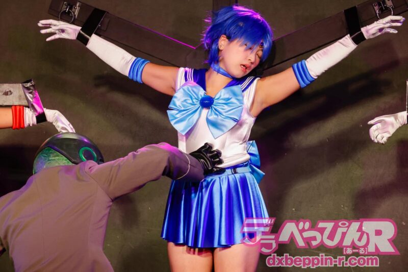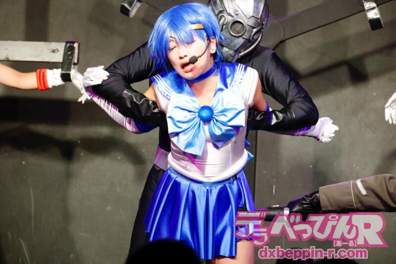 勢いに乗った怪人たちは、セーラーアレスのいくらちゃんに襲いかかります。男性器を模した妖しいハンマーで殴打され、セーラーアレスの大切な部分である胸のブローチを重点的に責められると、いくらちゃんは悶絶。電マ型武器が胸、お尻、股間を執拗に攻撃し、ついに力尽きた彼女はだらりと崩れ落ちる姿に、会場は異様な熱気に包まれました。