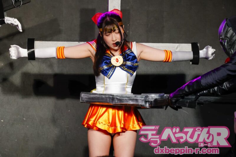 ヒロインたちのリーダー的存在、セーラーメルクスの梨花ちゃんは最後に連行されます。斧型武器で股間やお尻を容赦なく引き裂かれ、胸のブローチを攻撃されると、全身のエネルギーを吸い取られた彼女は、電マ型武器による全身への攻撃に耐えきれず、壮絶な昇天を迎えました。