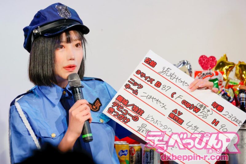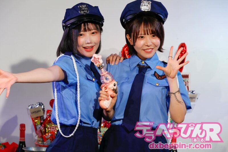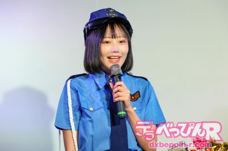 イベントは、ややちゃんによる影ナレ(影アナウンス)からスタート。こちらは「ふたりごと」ではなく「ひとりごと」として会場を温めます。そして2人はポリスのコスプレ姿で登場! 2人ともバッチリ似合っており、超キュートな姿にファンは大興奮。「『コスプレしよう』とLINEが来たけど、AVで着たことのないポリスにした」とややちゃん。AVでポリスのコスプレをすると、ちょっとやっかいなことになるので、業界的にご法度なのです(笑)。