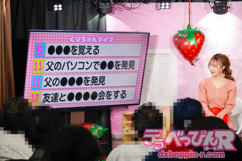 「5歳で〇〇〇を覚える」「11歳で父のパソコンで〇〇を発見」、「12歳で父の〇〇〇を発見」と、くりちゃんがお父さんから多大な影響を受けてきたことが明らかに(笑)。しかもその内容がかなりマニアックだったことも判明し、会場は爆笑に包まれました。