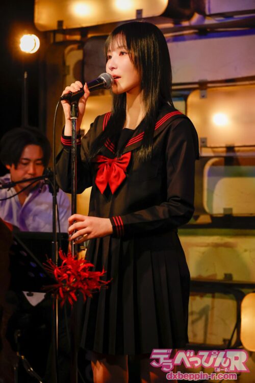 「今回のライブの演出は全部私がやりました。私が赤い花や布を持ってきたものを(ライブハウスの)店長さんにお願いしてステージを装飾していただきました。曲を最初に決めたときに、なぜかたまたま赤色がモチーフの曲が多かったんです。血液もそうですけど、巡るものってやっぱり赤になっていくんだなっていうことです。
