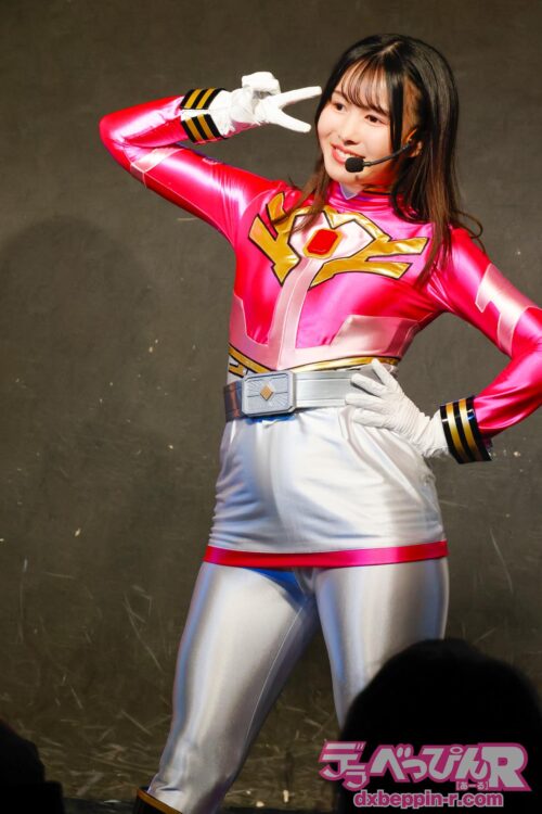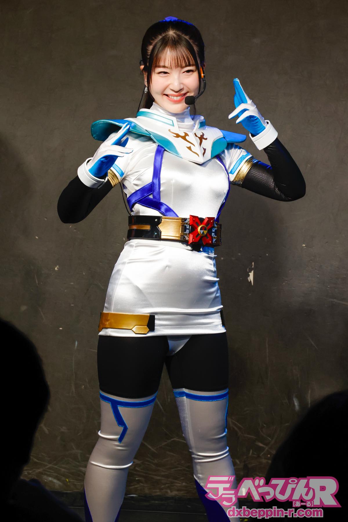 今回ステージに立ったのは前乃菜々ちゃん(アースホワイト)、有村のぞみちゃん(インスペクター)、真白ふわりちゃん(コウガイガー セイラ)、幾野まちちゃん(アンジェピンク)の4名。白い照明がタイトなコスチュームを照らし、ボディラインを鮮やかに浮き立たせ、観客の視線を一気に引きつけます。