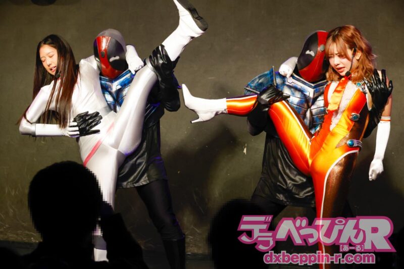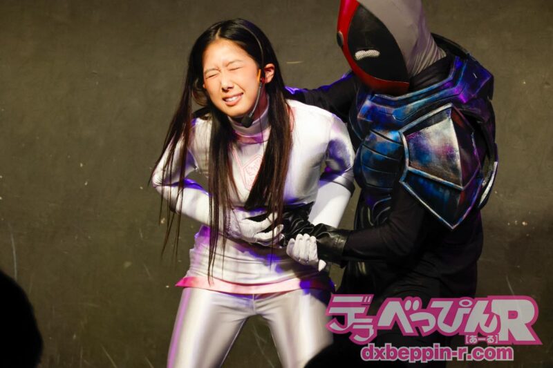 強化スーツを身に着けた戦闘員が再び登場。菜々ちゃんにパンチ、のぞみちゃんにキックを浴びせ、一気に優勢に。2人は「ぐっ……」と呻きます。戦闘員は背後から菜々ちゃんの首を締め上げチョークスリーパー、のぞみちゃんも同時に捕らえられ、両腕を背後に捻り上げます。これには2人とも失神寸前。瞳が虚ろになり、気を失いかけているところに、大開脚の辱めを受け、会場がどよめきます。